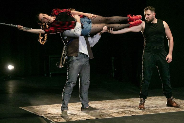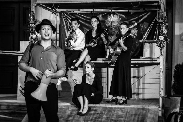 Valcz Péter üres térre épített koncertszínházi koncepciója különleges hangszeres színészi feladat a Toldi Miklós történetét eljátszó öt színésznek.
